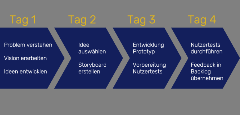 In nur vier Tagen entwickeln, testen und validieren wir Lösungen. Google Ventures hat diese Methode entwickelt. Sie kombiniert die besten Ansätze aus Geschäftsstrategie, Innovation und Design Thinking.